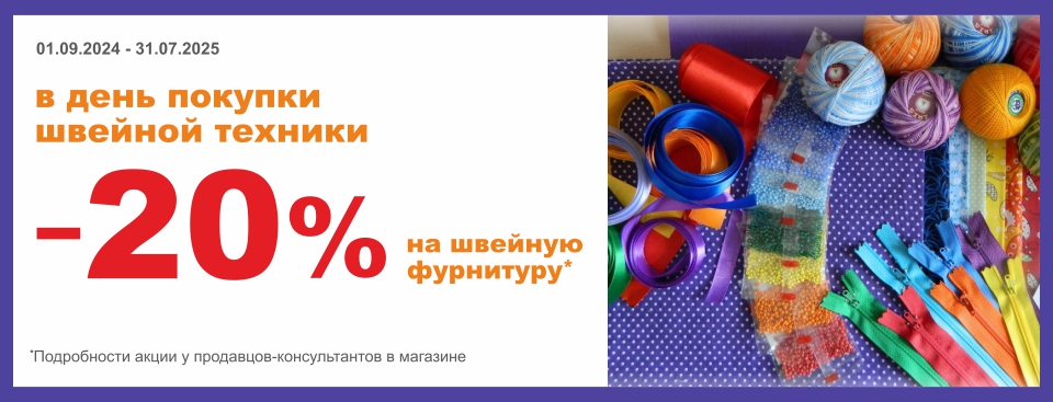 Алгоритм простой: покупаете швейную машину или оверлок, в этот же день выбираете фурнитуру* и получаете на нее минус 20% в чеке. Не откладывайте творчество на потом — берите всё необходимое сразу и с большой выгодой!